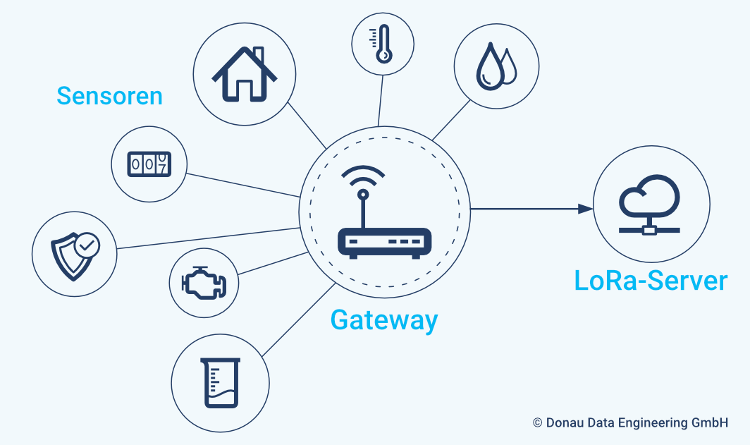 LoRaWAN ermöglicht energieeffiziente, drahtlose Übertragung von Daten über große Entfernungen. Sensoren oder Geräte senden kleine Datenmengen an Gateways, die diese Daten an zentrale Server weiterleiten. LoRaWAN nutzt lizenzfreie Frequenzen und ist besonders für Anwendungen geeignet, bei denen niedriger Stromverbrauch und große Reichweite wichtig sind.